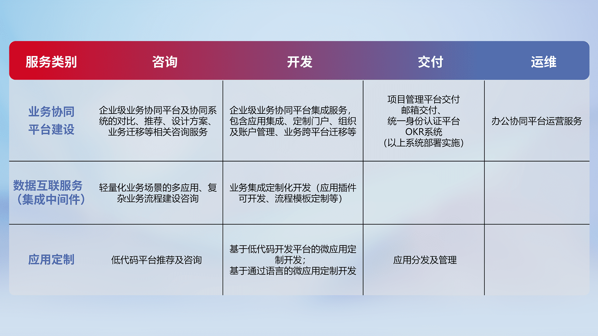 针对钉钉、、企微、、、IDaas等平台级产品提供产品的规划、、方案、、、交付、、、、定制化开发等服务,,实现如统一协同办公、、智能客户服务、、、、混合会议管理、、、、智能数据查询、、、、等业务场景,,,实现数字化转型。。
